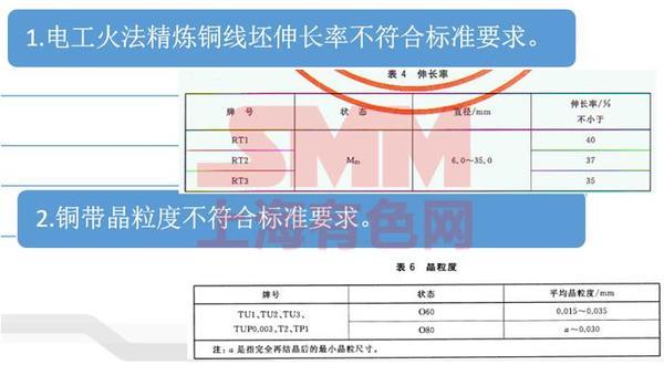 銅及銅合金產品在檢測過程中發現的一些問題,主要包括電工火法精煉銅線坯伸長率不符合標準要求、還有銅粉量檢測偶爾也會不達標,這方面主要因為熱處理工藝或者鑄軋工藝不太好心導致的,然后清代另外就是同代的精密度。另外銅帶晶粒度測試經常遇到不符合標準要求,這個標準要求O60在0.015—0.035mm之間,檢測出不在上線上以上的,下線以下,這方面也是由于熱處理工藝處理不好導致的。