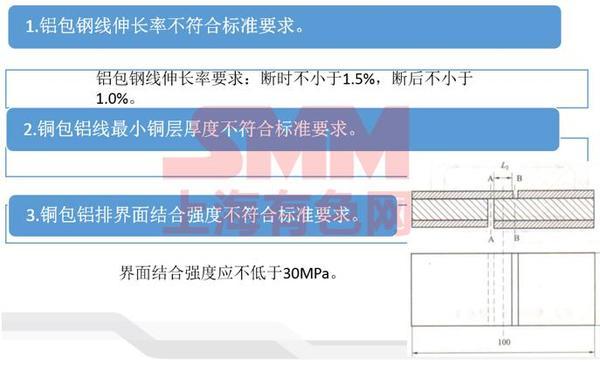 對于雙金屬產品的檢測中,我們發現的問題就比較多了,這方面主要是由于雙金屬從生產工藝而言,他要求的是,兩個金屬之間達成完美的冶金融合,但是我們檢測過程中,其實是發現很多情況他并沒有達到那種狀態,所以像鋁包鋼線伸長率不符合標準,還有銅包鋁線最小的銅層厚度不符合標準要求,因為生產工藝中工藝控制不好,所以他造成有地方比較厚有地方薄;銅包鋁排界面結合強度不符合標準,界面結合強度應不低于30MPa。