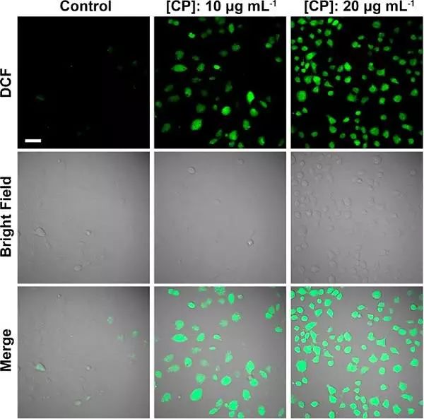 圖四、不同濃度CP納米點(diǎn)照射4 h后,DCFH-DA染色U87MG癌細(xì)胞的熒光圖像