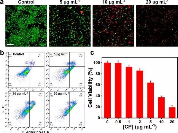 ?。╝)各種濃度CP納米點(diǎn)與U87MG細(xì)胞共孵育24 h后,對(duì)細(xì)胞的活/死染色;(b)CP納米點(diǎn)處理U87MG細(xì)胞12 h后,細(xì)胞凋亡圖;