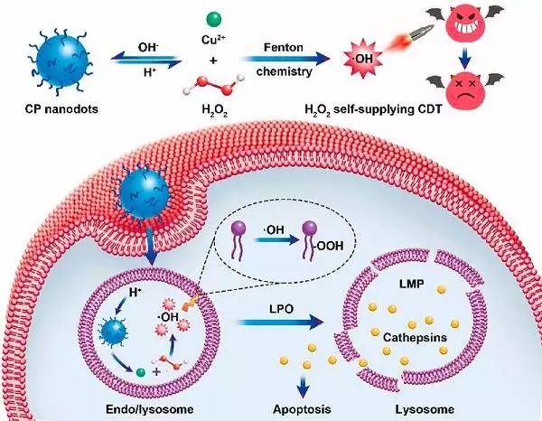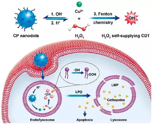 2+的配位,OH-輔助制備CP納米點(diǎn)可在酸性pH下發(fā)生逆轉(zhuǎn)。在癌細(xì)胞內(nèi)吞作用后,pH響應(yīng)性的CP納米點(diǎn)在酸性的胞內(nèi)體和溶酶體中分解并釋放具有Fenton催化活性的Cu2+和H2O2。分解產(chǎn)物之間發(fā)生的類Fenton反應(yīng)產(chǎn)生•OH,通過(guò)LPO過(guò)程破壞溶酶體膜的完整性,從而引發(fā)癌細(xì)胞死亡。小粒徑的CP納米點(diǎn)在腫瘤組織中能有效富集,而且CP納米點(diǎn)具有pH調(diào)控的•OH生成性質(zhì)。,因此,CP納米點(diǎn)在體內(nèi)具有較小的毒副作用,并能提供優(yōu)異的化學(xué)動(dòng)力學(xué)功效。該工作首次報(bào)道了Fenton型金屬過(guò)氧化物納米材料,并證明CP納米點(diǎn)可以作為H2O2自供型 CDT抗癌試劑。文獻(xiàn)鏈接:Synthesis of Copper Peroxide Nanodots for H2O2 Self-Supplying Chemodynamic Therapy(JACS,2019, DOI:10.1021/jacs.9b03457)