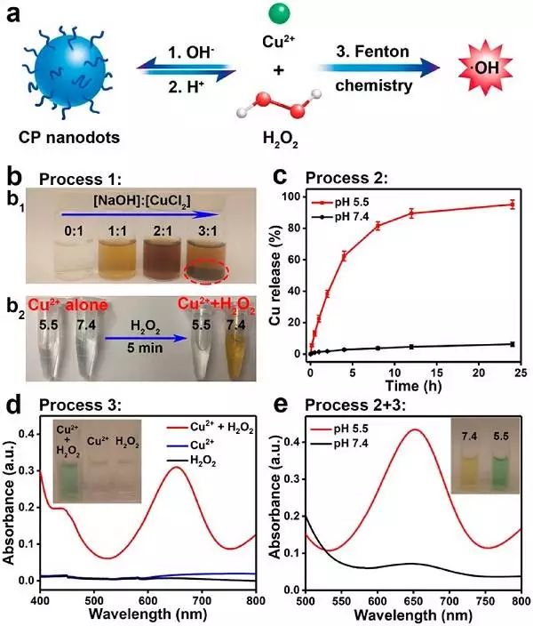(a)CP納米點(diǎn)的形成和解離的示意圖;(b)b1:在不同摩爾比的NaOH與CuCl2下,在PVP存在下獲得的CP材料的照片;b2:添加H2O2前后具有不同pH值的CuCl2溶液的照片;