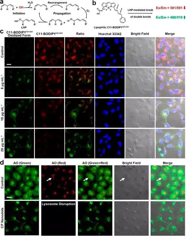 ?。╝)•OH引發(fā)的LPO的一般機(jī)理;(b)親脂性C11-BODIPY探針用于LPO的主要產(chǎn)物脂質(zhì)氫過(guò)氧化物(LHP)的比率熒光成像檢測(cè);