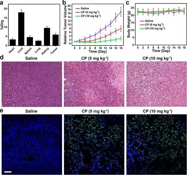(a)在靜脈注射24 h后,Cu在U87MG荷瘤小鼠的主要器官和腫瘤中的生物分布;(b)鹽水(對(duì)照組)或不同劑量的CP納米點(diǎn)處理后U87MG荷瘤小鼠的相對(duì)腫瘤生長(zhǎng)曲線;