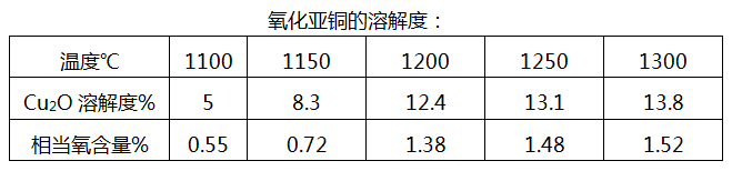 (1)本發(fā)明采用將純銅在含氧條件下進行高溫?zé)崛郏?dāng)純銅在中頻爐中高溫熔化時,與氧接觸,生成氧化亞銅:4Cu+O2=2Cu2O所生成的氧化亞銅立即溶解于銅熔體中,氧化亞銅在銅溶體中的溶解度,隨溫度的升高而增加,當(dāng)溫度在大于某一溫度時熔體中Cu2O含量超過12.4%以上時,熔體將分為兩層,在飽和Cu2O的熔體上表面是過剩析出的氧化亞銅。熔解在銅水中的氧化亞銅隨著氧化時間的延長生成量會越來越多,如下表所示:
