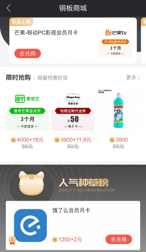 銅板商城此次的密集上新,一以貫之地堅持了嚴選產品理念,引入的商品與客戶日常生活緊密相關,既有實物商品,也有虛擬權益類商品。其中,實物商品涵蓋廚、衛、臥、學習、健身、出行等高頻場景,比如美的、九陽、飛利浦小家電,小米旅行箱,恒源祥毛巾,碧然德凈水器,耐克旅行包,特美刻保溫杯等等;虛擬的權益類商品,則緊貼客戶線上生活場景,如電商、互動娛樂、便利生活等。比如,餓了么會員月卡、美團外賣代金券,愛奇藝、騰訊視頻、騰訊音樂、優酷視頻、芒果TV、騰訊體育等主流娛樂影音平臺的會員權益。此外,還有哈根達斯的代金券,等等。