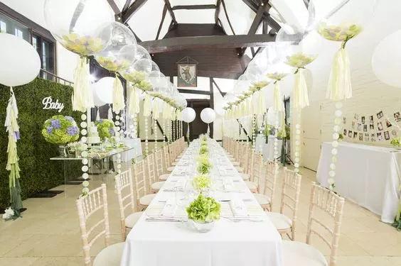 如果室內(nèi)場(chǎng)地高度足夠的話,可以考慮用氣球在屋頂裝飾。高低錯(cuò)落有致,一下子就有雅致氣息了呢。