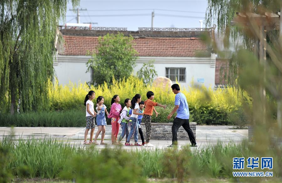 寧夏永寧縣原隆村的孩子們在新居前的休閑廣場上玩耍(2018年8月攝)。新華社記者 劉軍喜 攝