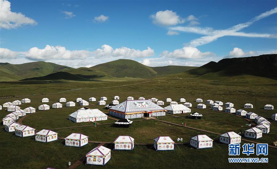 甘肅甘南藏族自治州碌曲縣尕海鎮尕秀村帳篷城度假區(2018年8月10日無人機拍攝)。新華社記者 陳斌 攝