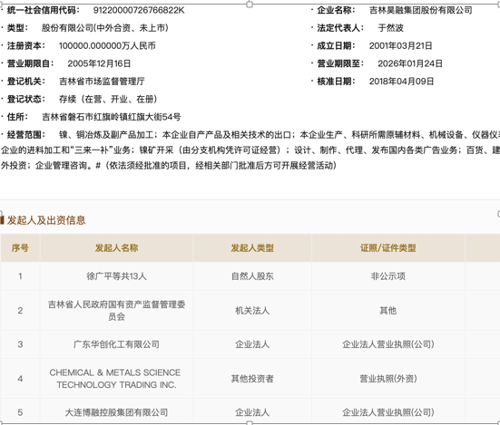 昊融集團官網顯示,公司由原吉林鎳業(yè)集團有限責任公司改制重組設立的產權多元化企業(yè),總部位于吉林省磐石市。公司始建于1960年,現已成為集科、工、貿于一體,專業(yè)從事金屬產品生產加工、新能源新材料開發(fā)、金融資本商貿運營的大型跨國集團公司,員工7000余人。