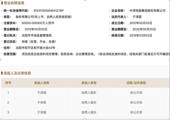 工商信息顯示,中澤集團注冊資本為5億元,股東分別為于澤國、于澤英、于澤旭。