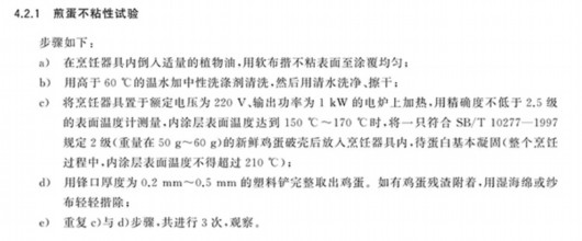 記者查閱了品牌方在聲明中提及的國家標準GB/T 32388-2015《鋁及鋁合金不粘鍋》,其中提及,鍋的不粘性要求要符合GB/T 32095.2-2015中 《家用食品金屬烹飪器具不粘表面性能及測試規(guī)范第2部分:不粘性及耐磨性測試規(guī)范》的要求。而在這份文件中,對煎蛋的不粘性試驗提及:“在烹飪器具內(nèi)倒入適量的植物油,用軟布揩不粘表面至涂覆均勻;用高于60度的溫水加中性洗滌劑清洗,然后用清水洗凈、擦干。”