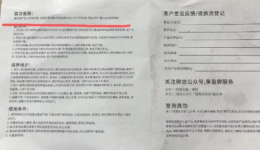 而且,這款不粘鍋的說明書上也注明:“首次使用時,請先將產(chǎn)品上所有標簽、合格證去除,然后在鍋內(nèi)放入約70%的水,完全燒開,煮5-6分鐘后倒掉。”