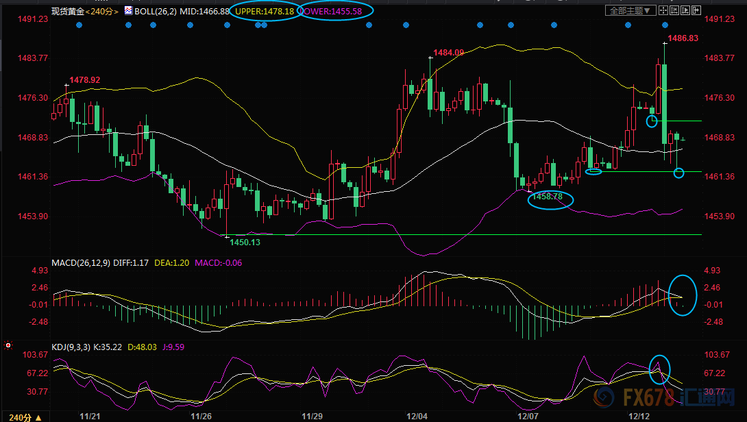 現貨黃金日線小時級別:震蕩;金價在近期震蕩區間頂部附近錄得“吞沒”看空信號,MACD有死叉趨勢,KDJ死叉運行,后市偏向震蕩下行,初步支撐在1462.48附近,若跌破該支撐,則可能會進一步試探布林線附近支撐。