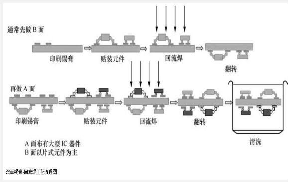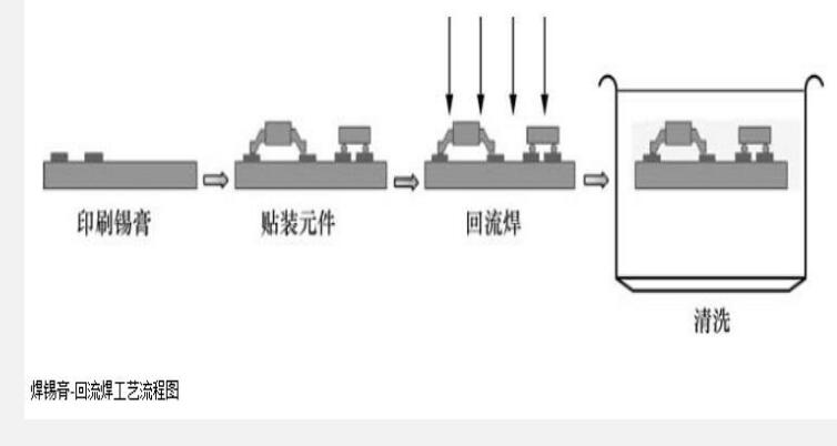 ①焊錫膏-回流焊工藝,如圖所示。該工藝流程的特點:簡單、快捷,有利于產品體積的減小。該工藝流程在無鉛工藝中更顯示出優越性。