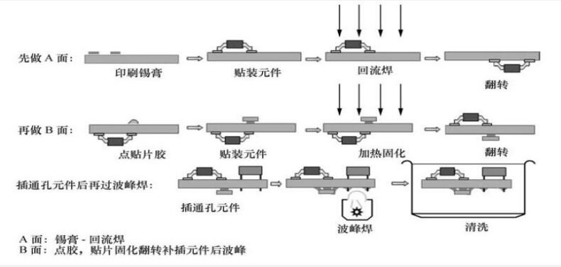 ④混合安裝工藝流程,如圖所示。該工藝流程的特點是:充分利用PCB雙面空間,是實現安裝面積最小化的方法之一,仍保留通孔組件價廉的優點,多見于消費類電子產品的組裝。