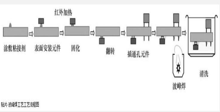 ②貼片-波峰焊工藝,如圖所示。該工藝流程的特點是:利用雙面板空間,電子產品的體積可以進一步做小,并部分使用通孔組件,價格低廉。但設備要求增多,波峰焊過程中缺陷較多,難以實現高密度組裝。