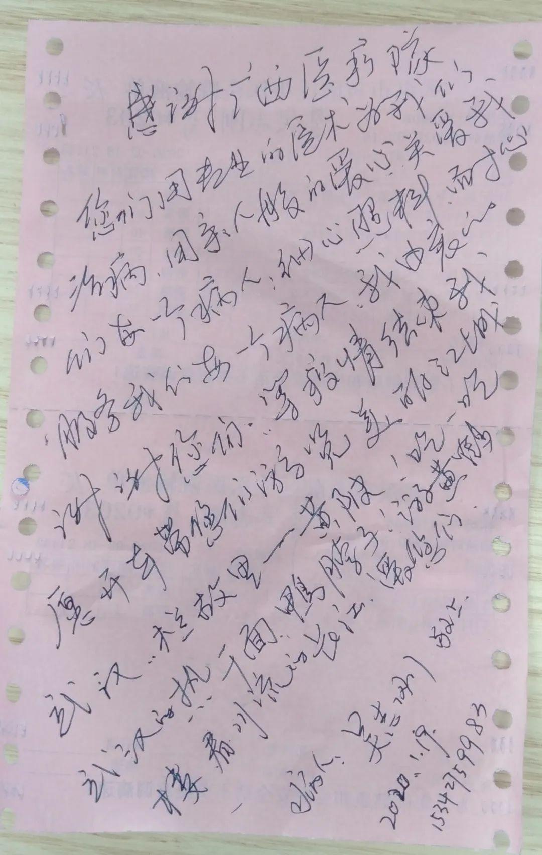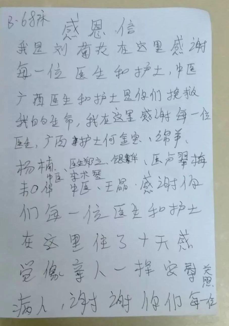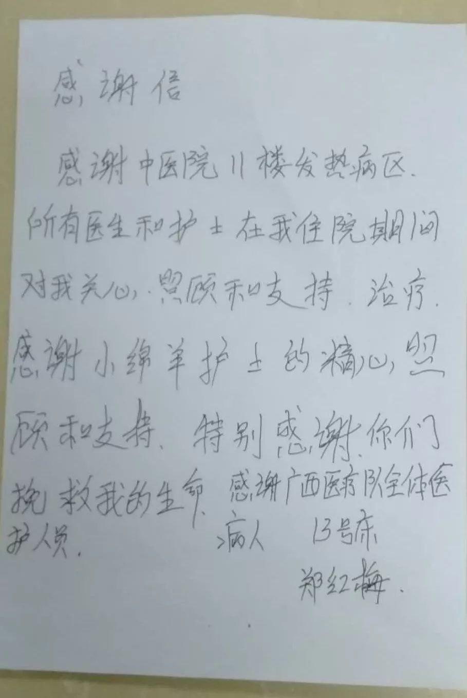 截至2月19日,廣西首批支援湖北抗疫醫療隊,累計收治病人數為260例,其中重型人數77例,危重癥人數43例,已治愈出院人數41例。病人寫的感謝信接踵而至,他們發自肺腑感謝醫護人員的悉心照顧。