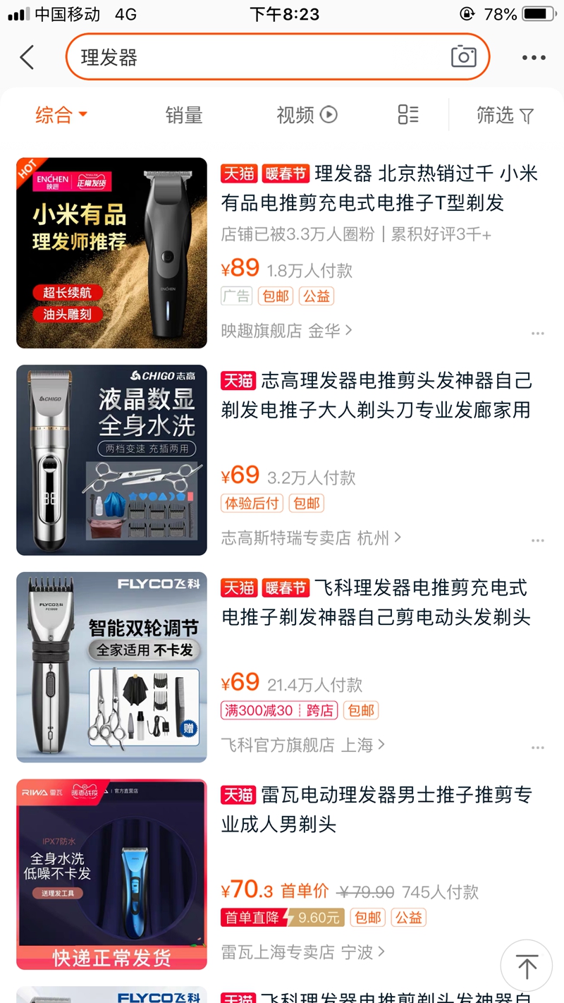 2月19日,拼多多官微公布了“宅家十大商品熱銷榜單”,理發器高居榜首,超過了口紅、瑜伽墊、打蛋器以及睡衣。公開數據顯示,拼多多平臺理發器搜索次數同比增長410%,包括飛科、奧克斯等品牌在內的數十款理發器銷量同比上漲290%,最近7天理發器商品GMV(注:成交總額)超過3000萬元。在淘寶、京東等其他電商平臺上,理發器同樣熱銷,中新經緯記者在淘寶上搜索“理發器”發現,銷量最高的一款本月已賣出20多萬。