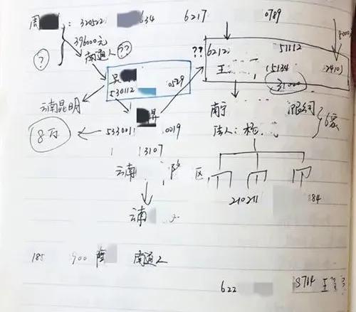 翻到位洪明工作筆記本的最新一頁,是一張手繪的防疫口罩詐騙網的分析導圖,雖然分叉復雜,但指向明確。從受害人到嫌疑人,一共8層關系網絡,一層一層密密麻麻,摸清楚的寫得明明白白,還沒摸清楚的打著問號。
