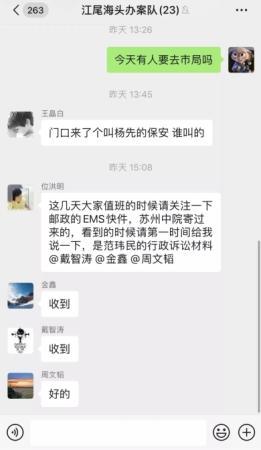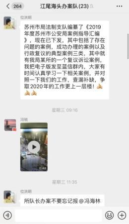 位洪明自己精通法律、精通辦案程序,就是時時刻刻擔心同志們因為不細致把好事辦成壞事,于是辦案隊的工作群,幾乎成了位洪明“嘮嘮叨叨”的專場,每天各種叮囑、提醒,像鬧鐘一樣,在每個辦案民警的頭上“叮叮當當”響個不停。他發的最后一條信息是20日15:08的,他說:“這幾天大家值班的時候關注一下郵政的EMS快件,蘇州中院寄過來的,看到的時候請第一時間給我說一下,是范某的行政訴訟材料。@戴智濤@金鑫@周文韜”消息發出12分鐘后,他倒在了自己的崗位上。