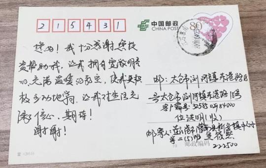 翻看他的筆記本時,在一堆案件信息里掉出一張明信片,上面寫著:“您好!我十分感謝您資助我,讓我擁有寬敞明亮的、充滿溫暖的教室,使我更積極主動地學習,讓我對生活充滿信心、期待!謝謝!連云港灌南縣新安鎮中心小學二(5)班 魚筱熙”。