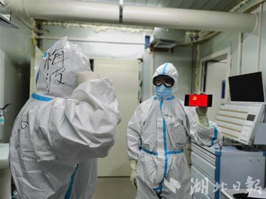 2月21日下午3時許,雨過天晴的火神山醫院,舉行了一場特殊的火線入黨儀式:34名在抗疫一線的入黨積極分子,通過手機視頻等方式,多地同步面向黨旗莊嚴宣誓。