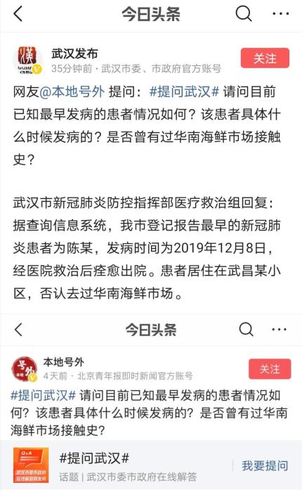 中新網客戶端2月26日電(李金磊) 26日,認證為“武漢市委、市政府官方賬號”的“武漢發布”發布微頭條稱,武漢市新冠肺炎防控指揮部醫療救治組回復:據查詢信息系統,武漢市登記報告最早的新冠肺炎患者為陳某,發病時間為2019年12月8日,經醫院救治后痊愈出院。患者居住在武昌某小區,否認去過華南海鮮市場。