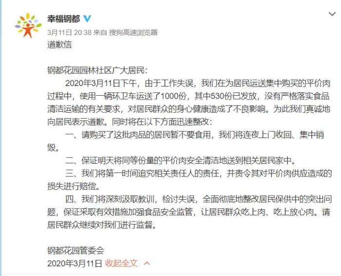 中新網3月12日電 就網友曝光“武漢市青山區鋼都花園用環衛車運送平價肉”一事,鋼都花園管委會11日晚通過微博道歉,表示將上門收回平價肉集中銷毀并追責。