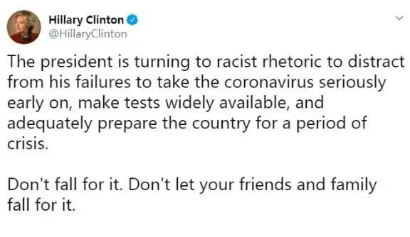 希拉里批特朗普“中國病毒”言論 :種族主義,掩蓋失職
