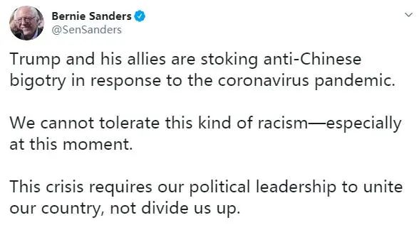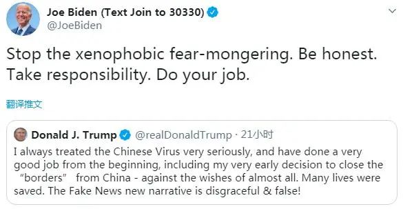 民主黨總統(tǒng)候選人、前副總統(tǒng)拜登轉(zhuǎn)發(fā)了特朗普的推特,并說:“停止散播仇外恐懼。說實(shí)話。承擔(dān)責(zé)任。做你的工作吧。”