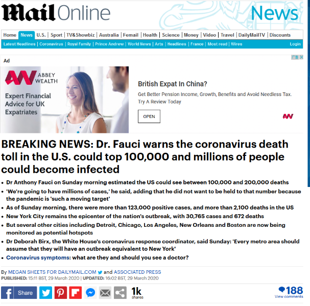 美國感染病例總數應該會有數百萬而疫情可能導致20萬美國人死亡 這個預測不是其實國家普通人隨便猜測的,而是美國頂級傳染病專家自己說的!